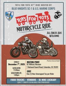Blue Knights Toy’s for Tots Ride – December 7, 2025 – ABATE CWC will meet at Bogarts Restaurant at 11:00am, KSU at 11:30, to ride as a group to the Toys for Tots 41st Ride Hosted by Blue Knights SC-1 & U.S. Marine Corps.